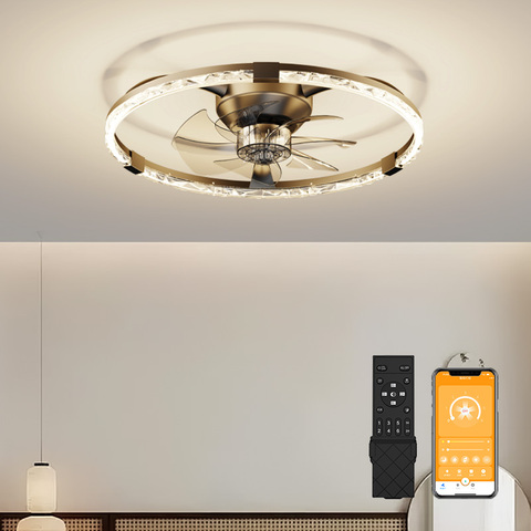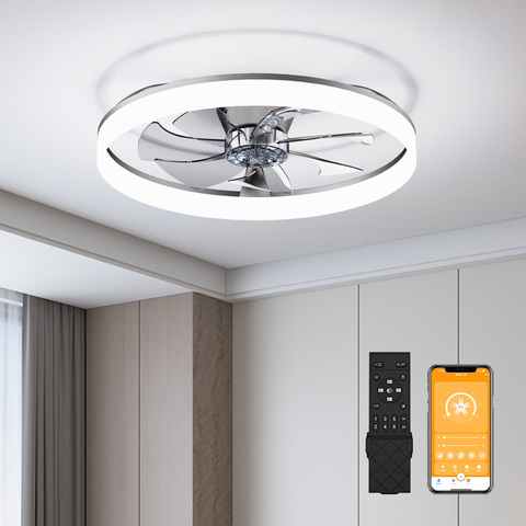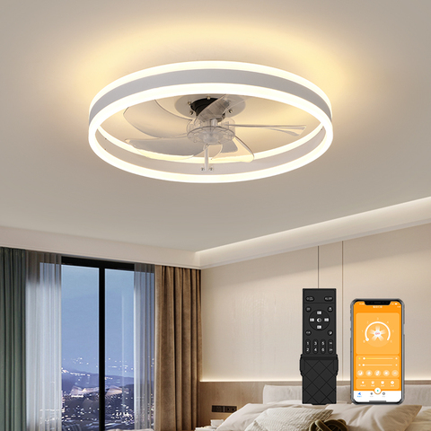 Ventilador de techo minimalista moderno con luz LED, control de aplicación inteligente, motor de CC reversible ultra silencioso, montaje empotrado para dormitorio