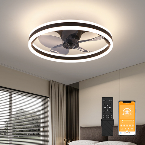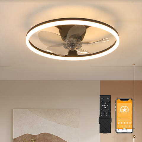 Ventilador de techo LED circular de perfil bajo moderno Control de aplicación remota sin ruido Motor de CC de seis velocidades Cuerpo de metal negro para dormitorio